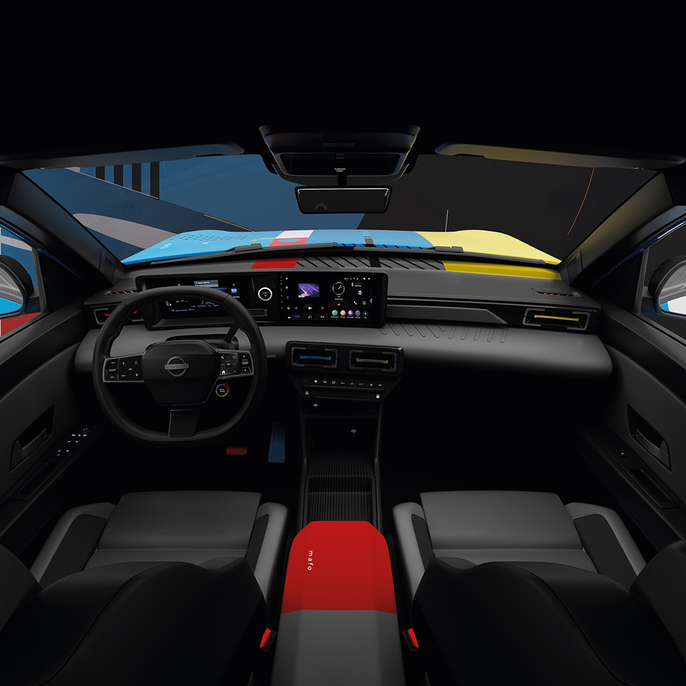 Dès le premier regard, la voiture affirme une identité forte. À mesure que l’on s’en approche, la richesse des détails se révèle. Les formes et les couleurs, volontairement asymétriques, composent un équilibre qui invite à observer le véhicule sous tous ses angles et à engager un dialogue visuel. Ce dialogue prend vie dès le démarrage, avec l’animation de l’écran principal qui se propage en vagues colorées, prolongée par les textures qui s’invitent à l’intérieur, des accents chromatiques sur les pédales, les éléments de ventilation, le volant et la console centrale. Des signatures graphiques simples qui font écho au design extérieur de la Micra Édition Signature et renforcent l’expérience à bord.